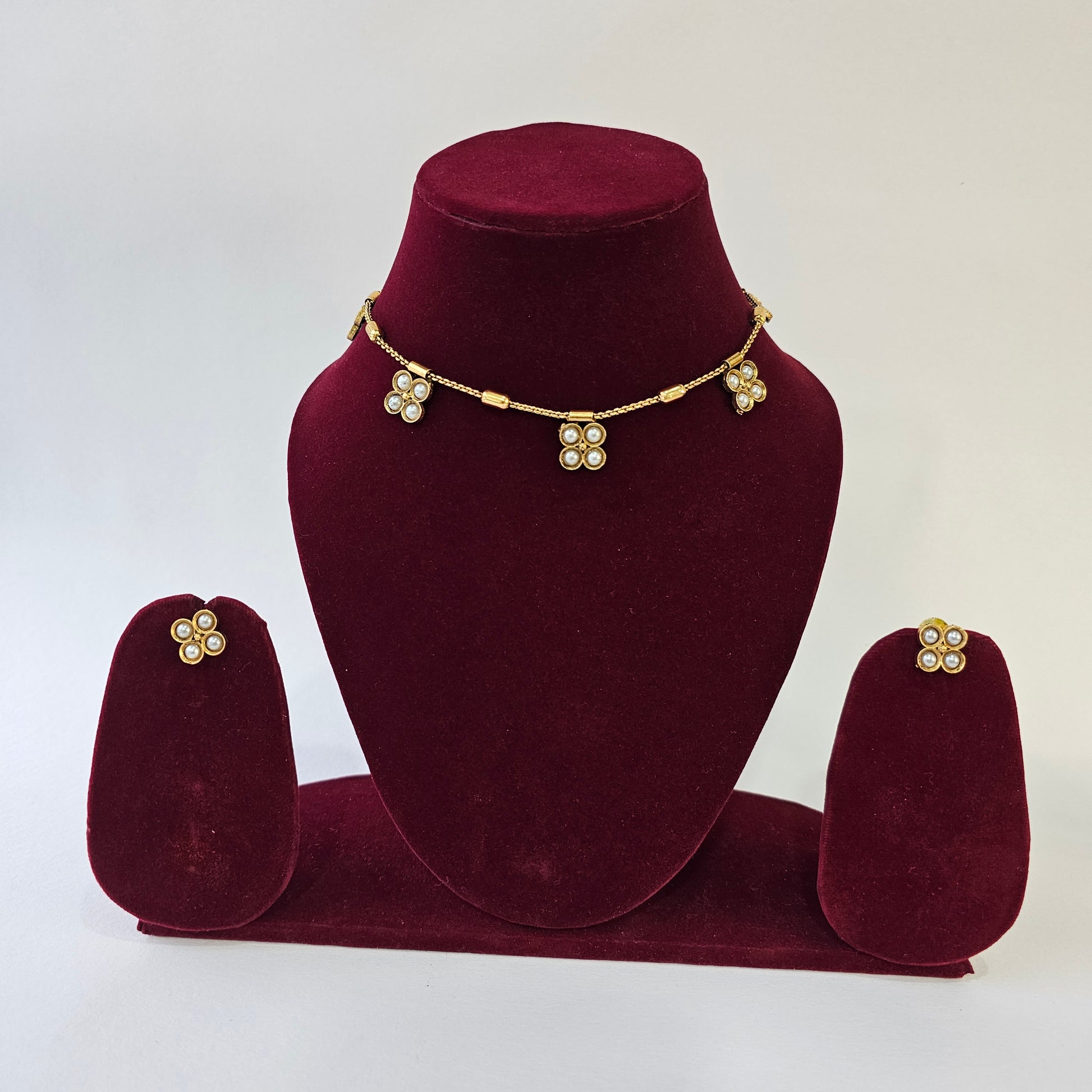 A delicate necklace set designed with floral motifs highlighted by soft pearl accents, evenly placed along a refined gold-tone chain. The lightweight construction and adjustable thread detailing offer a comfortable fit, while the subtle floral pattern adds a graceful traditional touch. The set is completed with matching stud earrings for a coordinated and elegant look.