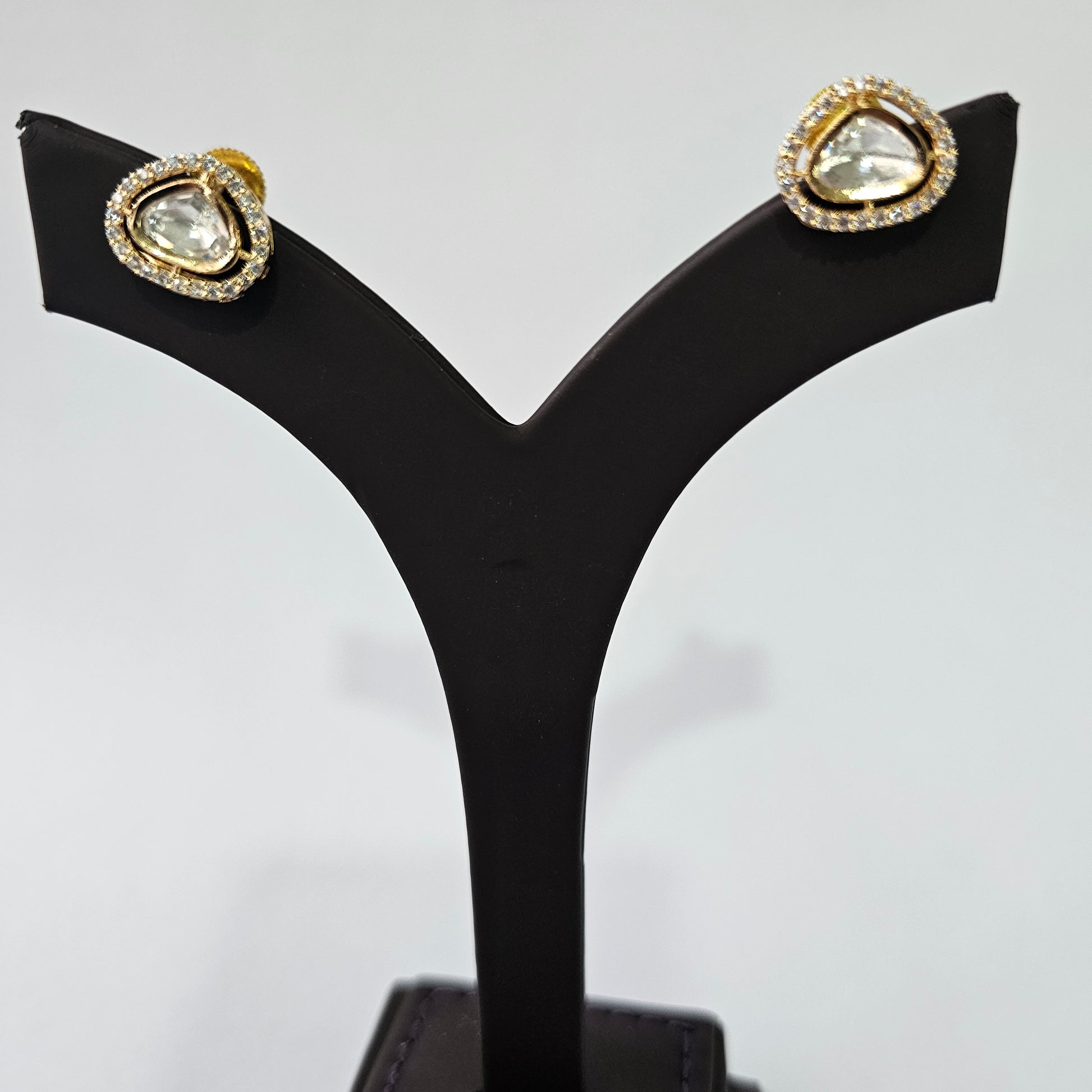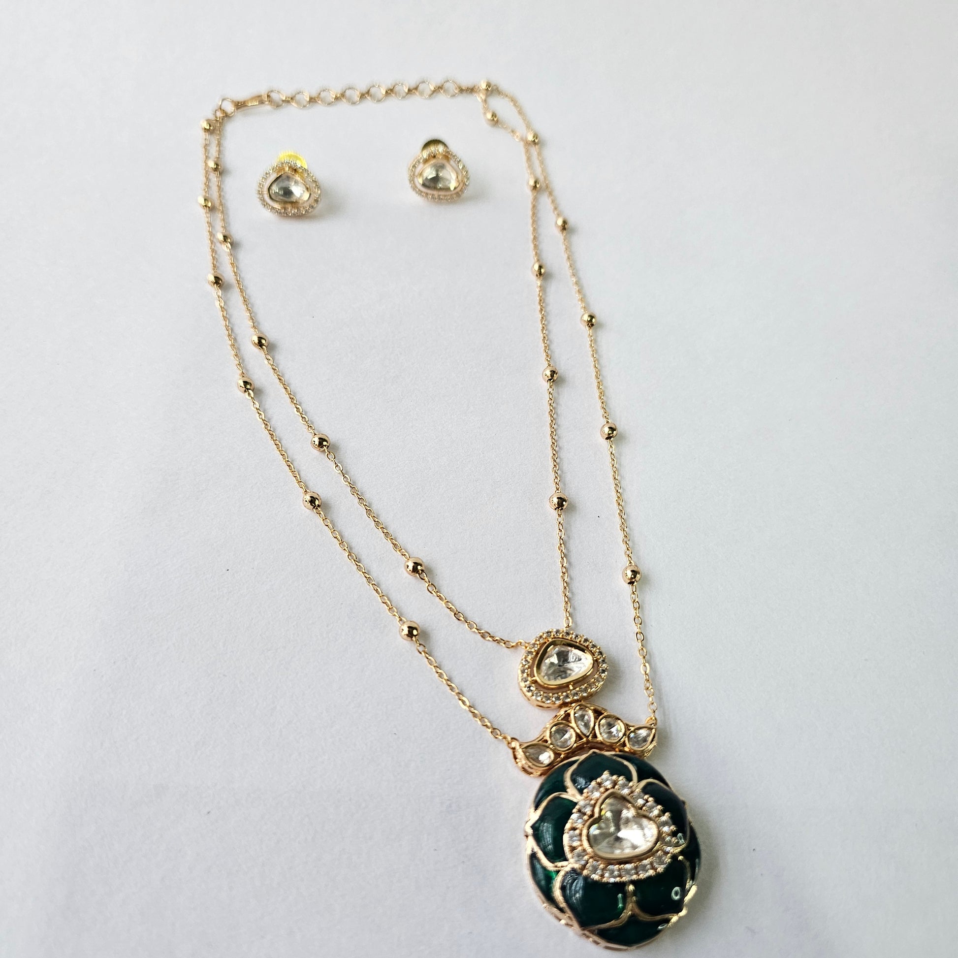 An elegant mid-length necklace set crafted in a polki-style jadau setting with meenakari accent work, finished in a rose rhodium tone. Designed with refined detailing and green-tone highlights, this piece features a graceful ornamental centerpiece paired with a delicate layered chain. Comes with matching stud earrings for a coordinated and sophisticated look.